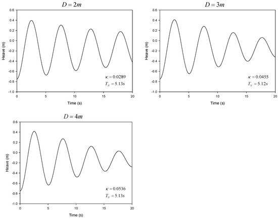 Figure 8 shows the CFD simulation of the heave-free decay test for different diameters of the WEC. The damping factor and damped natural period are indicated inside each plot. The viscous damping coefficient can be obtained using Equation (2), which is proportional to the damping factor. It can be observed from the plots that as the WEC’s diameter increased, the viscous damping increased due to the increase of the circumference length of the bottom of a cylinder where the generation of vortices occurs.