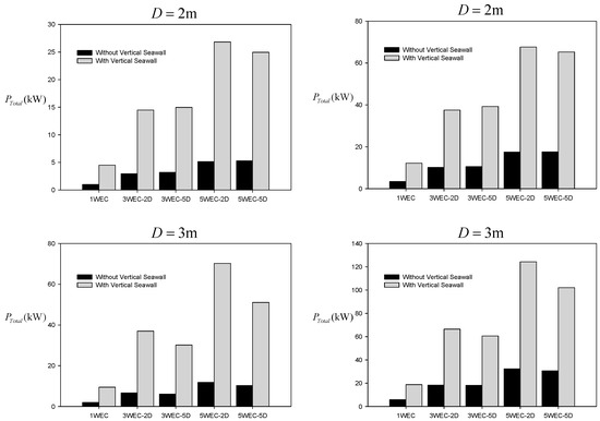 These results are further plotted below for a detailed analysis. In Figure 9, the total power output of various configurations of an array is assessed both for WECs without a vertical seawall and those with a vertical seawall. WECs situated in front of the seawall exhibited greater power extraction by the increase of WECs’ heave motion due to the formation of standing waves. Also, the extracted power drastically increased with the diameter as the larger WEC possesses the potential to accommodate larger PTO damping, enabling higher power absorption.