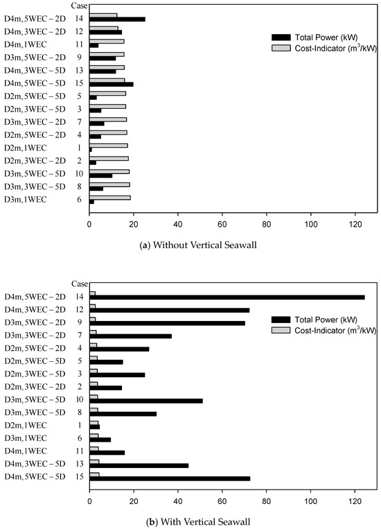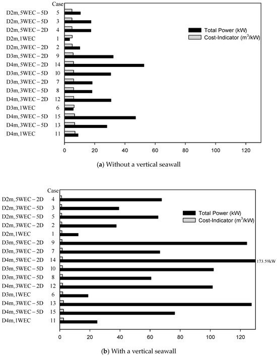 The cost-effectiveness of various configurations of an array of WECs is assessed based on a cost indicator, which reflects the cost associated with extracting unit power. In Figure 11 and Figure 12, the cost-effective configurations are prioritized according to the cost indicator, with the most favorable scenarios placed at the top of the plots. The WECs placed in front of a vertical seawall have substantially reduced the cost indicator with greater power extraction. This occurred because the vertical seawall increases the heave motion of WEC due to the formation of standing waves, resulting in increased power output for the equivalent submerged volume.