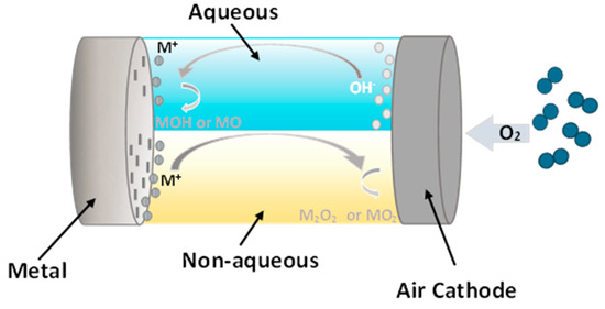 The special characteristics of metal-air batteries, including specific capacity and energy density, make them ideal for successful usage as energy storage devices. This type of battery consists of a metal anode, oxygen from atmospheric air, an air cathode, a separator, and an electrolyte (Figure 7). Inside metal-air batteries, an electrochemical reaction occurs between the metal anode and oxygen gas. Depending on the anode type, the electrolyte is selected. Therefore, the electrolyte can consist of an aqueous solution (potassium hydroxide), a non-aqueous solution, a neutral solution, a hybrid, and a solid state. The anode used in metal-air batteries can include Li, Na, Fe, Zn, Al, K, and other metals with excellent electrochemical equivalence [74,75].