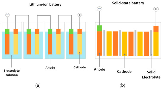 A solid-state battery (SSB) is an energy storage system that uses a solid electrolyte instead of a liquid electrolyte that is specific to the lithium-ion battery, as can be seen in Figure 8. The main component of a solid-state battery is the solid electrolyte, which can be made from ceramic, glass, polymer, or a mixture of these materials [76].