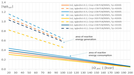 where KdRPC—cost of energy generated in compensating devices for consumers, tgφopt—value of tgφ factor for the optimal level of load reactive power compensation, LCOEr—levelized cost of reactive energy supplied from reactive power compensators to the load at the considered time of its annual utilization, Qp—peak reactive power consumption of the considered load, and Tp—peak load utilization time.