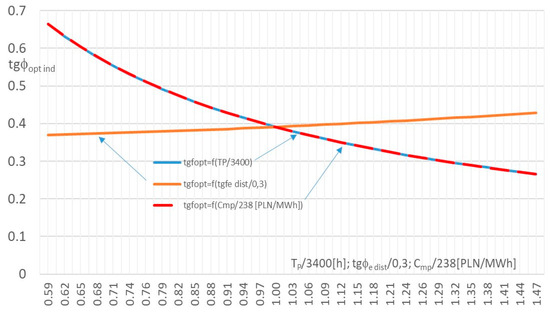 - The optimal compensation level of the customer load is strongly dependent on the price of electricity purchased by the DSO to cover network losses and also on the costs of using reactive energy compensation devices, which decrease with the rated power of the compensator applied; an increase in energy prices and a reduction in compensating device costs lead to a reduction in the optimal levels of the tgφopt factor.