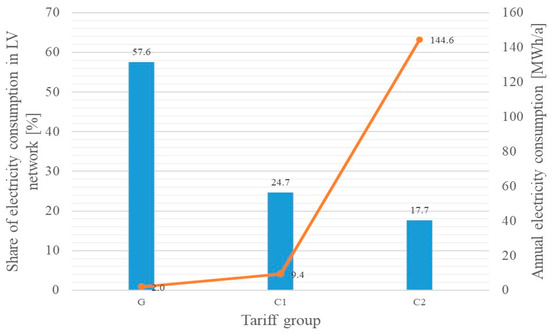 The grid loss statistics used in the study refer to the actual situation, i.e., losses resulting from the total load flow including distributed generation during the year at all voltage levels. The efficiency of electricity supply to low-voltage consumers depends on the load characteristics in the network and the structure of the power supply system. The load is characterized by the peak load utilization time Tp, while the losses of the network are characterized by the peak loss time τa different at particular voltage levels of the distribution network. Furthermore, the significant parameters are the resistances of the elements of the distribution system, as they differ depending on the capacity of the network resulting from the density of the supplied consumers.