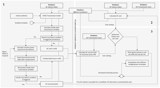 The AC and DC transmission and cost evaluation are based on the models from Figure 1, Figure 2, Figure 3, Figure 4 and Figure 5, respectively. For a selected candidate, the algorithm will check the most cost-effective yet suitable voltage/cable combination. The AC evaluation is done based on both a non-VAR-compensated system and a VAR-compensated system by adjusting the respective system admittance. The decision on the best solution is made based on the results of the respective equations, this being AC transmission ((4), (5)), DC transmission ((6), (7)), and finally the individual cost (8) [1].