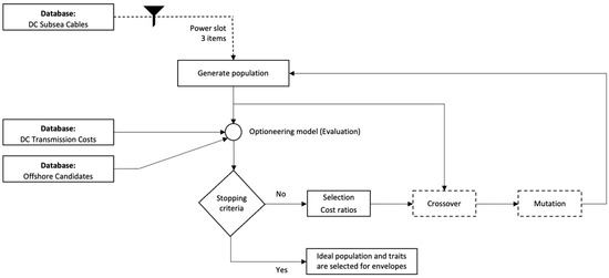 The genetic model is, therefore, the logical [1,40] and last step of the optioneering process and draws from the clustering model, thus encompassing the sample candidate database again with the pool of suitable AC and DC connections identified in the latter. Said model is predicated on the following assumptions: