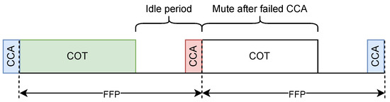 Floating FBE [33] changes the frame structure described in Section 3.1: instead of having the COT placed at the beginning and CCA at the end of the FFP, the COT is now directly preceded by CCA (Figure 4). Moreover, a node is allowed to start its CCA with a random offset within an FFP. This offset is selected as