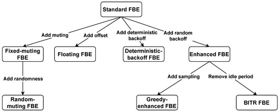 Classification of FBE variants proposed in the literature to enhance FBE with contention resolution capabilities.