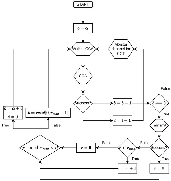 Deterministic-backoff FBE (DB FBE) is our second proposed variant based on the deterministic-backoff algorithm [38]. Instead of muting for a number of FFPs after a data transmission, DB FBE nodes refrain from accessing the channel (i.e., backoff) for several FFPs before a transmission. This backoff procedure is governed by the variable b, which indicates the number of FFPs during which a node cannot access the channel. Initially, b is set to an initial backoff value . During the backoff periods, the node monitors the channel and decrements b after each empty FFP. An FFP is determined to be empty on the basis of a single CCA, which is conducted at the beginning of the FFP. If the node detects a busy channel, then an interrupt counter i is incremented. Once b reaches zero, the node can start transmitting. If a collision occurs, the node increments a retransmission counter r, otherwise r is set to zero. After each transmission, a new backoff value is selected. If the value of r modulo (maximum number of retransmissions) is less than a threshold of , the node sets and resets i, in the other case b is randomly selected from the range of . Figure 5 represents the flowchart of the entire DB FBE algorithm.