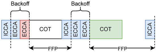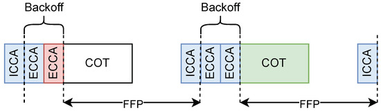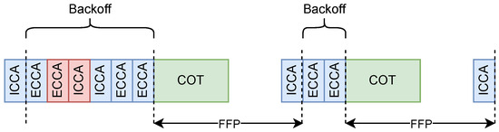 Wijesiri and Li [35,39] define a method to improve fairness in channel access for LTE unlicensed (LTE-U) networks coexisting with Wi-Fi. Since LTE-U channel access shares some common features with FBE (most notably a duty cycle approach), we adapt this scheme and assess its performance in the following, referring to it as enhanced FBE (E-FBE). E-FBE introduces a backoff mechanism before channel access and defines two types of CCA: initial CCA (ICCA) and extended CCA (ECCA). ECCA is responsible for decrementing backoff after detecting an idle channel. On the other hand, during ICCA, backoff cannot be decremented even if this operation is successful. If an E-FBE node wants to access the channel, it will perform ICCA. If ICCA is successful, the node selects a random number N from the range , where Q defines the maximum backoff value. Then, the node enters the backoff phase, which starts with repeated ECCAs performed until . If a transmission occurs during ECCA or ICCA, the node has to become silent for the COT, wait for ICCA at the end of the FFP, and perform a new backoff value selection. When the node reaches , it immediately starts transmission. In Figure 6, an example of the backoff in E-FBE can be found. At the beginning, the node successfully completes ICCA and the first ECCA. During the second ECCA the channel is sensed as busy and the node is silent until the end of the FFP. Finally, the whole backoff phase is successfully performed and the channel is accessed.