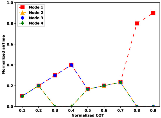 Next, the validation results for floating FBE are depicted in Figure 11c. The curve of normalized airtime is similar for every node, regardless of offset, until an upper-bound condition is met. After exceeding this boundary COT value, the channel is completely dominated by the node with the lowest offset (here, the fourth node). This situation can occur only when the difference between the maximum offset of the fourth node’s CCA inside its FFP () and the minimal transmission start time for the first node () is less than the length of the COT ():