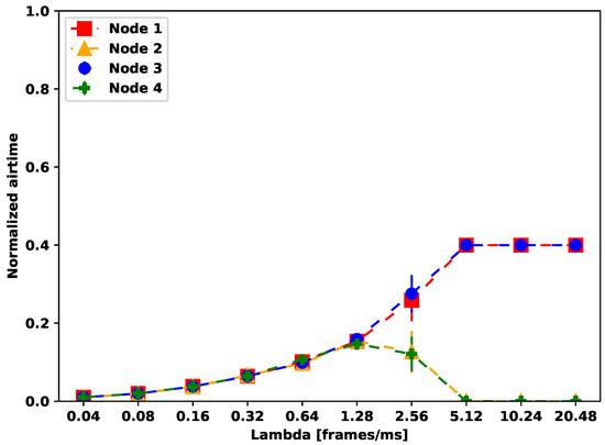 The simulator also introduces a constant-rate traffic generator, modeled with an exponential distribution. Each frame created by the traffic generator is described by its duration, expressed in microseconds, which identifies the airtime needed for a complete frame transmission. Furthermore, each node participating in the simulation has its own buffer. The implementation of the traffic generator is validated by a particular edge case in Figure 9 for a value of normalized COT equal to 0.4. The buffer size for each node is constant and set to 200 frames, while the value of lambda (mean frame arrival per millisecond) is successively doubled. The results of this scenario are depicted in Figure 10. For the lowest lambda values, the gaps between frame arrivals are large enough to guarantee an equal share of the channel. After exceeding a value of 1.28 frames/, network operation collapses (i.e., nodes have unequal channel access probabilities) and finally, under saturation, the channel becomes dominated by the first and third nodes. This behavior matches the results of Figure 9 for a normalized COT of 0.4, which implies the proper operation of the simulator also under non-saturation.