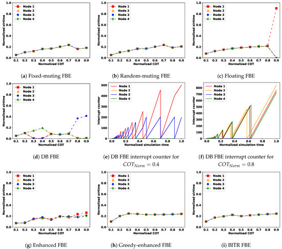For DB FBE, the validation results are presented in Figure 11d. Similarly to standard FBE, DB FBE also suffers from node-domination problems. Moreover, according to the DB FBE backoff selection algorithm, the backoff value cannot be randomly selected. Nodes always know about ongoing transmissions: collisions are impossible, the retransmission counter is not incremented, and the threshold value is never exceeded. For the lowest values of COT, as long as only one node wants to transmit a frame at a given time, a round-robin schedule is guaranteed. When the normalized COT is between 0.3 and 0.4, the channel is dominated by the second and fourth nodes, which continuously interrupt the channel monitoring phases, resulting in extremely high values of the interrupt counter (Figure 11e). Subsequently, transmissions interrupt the CCAs of two consecutive nodes, which again leads to a round-robin scheme. Finally, the channel is dominated by the third node due to the high values of the interrupt counter (Figure 11f). This behavior implies that DB FBE nodes must operate in synchronous mode (no shifts). Subsequently, we conclude that DB FBE cannot easily coexist with other channel access methods.