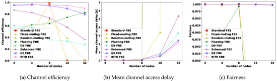 In Figure 13, we provide the simulation results for the non-optimized case. As expected, the measured metrics achieve the best values for eight nodes. However, changing the number of contending nodes without parameter optimization leads to significantly reduced performance. In the case of standard FBE, fixed-muting FBE, and random-muting FBE the main factor which determines this decrease is the periodicity of fixed frames. For non-optimized parameters, it is easy to cause overlapping of FFPs, which then leads to the synchronization issue depicted in Figure 2a and either constant collisions or, in the best case, only occasional transmissions. Floating FBE suffers from the problem of single-node domination, which is proven by unacceptable values of mean channel access delay and fairness, while also increasing channel efficiency. It turns out that DB FBE, greedy-enhanced FBE, and BITR FBE achieve similar results as in the optimized case, but with a visible decrease in channel efficiency and an increase in mean channel access delay. However, they maintain a high value of fairness. The worst performance among the backoff-based variants is achieved by enhanced FBE, where for 32 nodes, the value of mean channel access delay almost doubles.