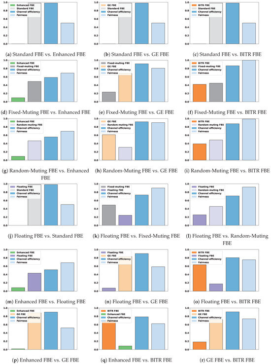 Figure 14 shows the results of the remaining 18 test cases of heterogeneous networks. We expect the aggregate normalized airtime of each variant to be close to 0.5, while the channel efficiency and fairness should be close to 1. We first look at the coexistence results of standard FBE (Figure 14a–c,j). The parameter setup for standard FBE is again focused on achieving the highest possible channel efficiency. This configuration results in complete channel dominance by standard FBE in each of the tests performed. The main reason behind such behavior is connected with perfect node coordination: the difference between two consecutive transmissions for standard FBE nodes is 9 —it becomes almost impossible for contending variants to decrement their backoff (if supported by that variant) and transmit in such short time windows.