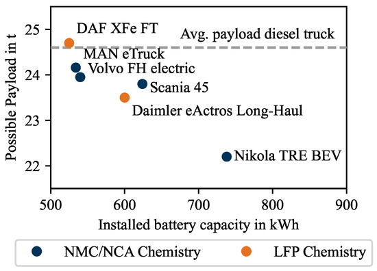 The dominant way of transporting goods in the European Union (EU) is road freight transport. A total of 75% of the transport performance in the EU is provided by land-bound road transport [1], accounting for a share of 8.5% of total EU CO emissions [2]. To reduce these emissions and to achieve the EU’s goal of climate neutrality in 2050 [3], a transformation towards zero-emission propulsion systems is needed. To accelerate the market penetration of these vehicles, the EU has set emission reduction targets of 15% by 2025 and 30% by 2030 [4], with the newest proposals to further tighten them to 45% by 2030 [5,6]. Industry and research are therefore pushing for market maturity and technical progress of various solutions for zero-emission vehicles [7,8,9]. In particular, due to their high efficiency, possible rapid market maturity, and the ramp up of a public charging network, which is being driven forward by politics and industry, BETs are seen as the most promising option for the initial transition towards zero-emission vehicles [10,11,12]. In order to achieve the emission targets mentioned, a rapid increase in the market share of BETs is necessary, which requires the active purchase decision of a truck operator for a BET. These purchasing decisions are largely driven by the total cost of ownership (TCO). An essential part of this TCO is the investment cost, which in turn depends largely on the cost of the battery [13]. In comparison to the purchasing decision for a diesel truck, the tank size is not dominating the investment cost. Therefore, the importance of the battery system choice is novel for truck operators. In the future, truck operators will have to choose the truck or battery system that promises the lowest TCO from a growing portfolio offered by manufacturers. This portfolio of announced models by European OEMs is shown in Figure 1.