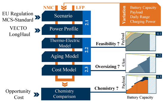 The relevant properties for a purchasing decision for the truck operator are the installed battery capacity, which leads to an achievable range, and the transportable payload, which is calculated from the tractor weight and the weight of the trailer [15] in relation to the maximum permissible gross vehicle weight (GVW). With the rise of the GVW limit to 42 for zero-emission vehicles [16], most announced models show a payload loss of around 500–1000 in comparison to an average diesel truck [4]. Nevertheless, lighter and significantly heavier vehicles have also been announced, which leads to a great variance in options regarding the maximal battery capacity. In addition to the maximum battery capacities, a lower number of battery packs can also be selected, which increases the variance even further. In terms of cell chemistry, the two predominantly proposed chemistries are lithium iron phosphate LiFePO4 (LFP) and nickel cobalt manganese oxide Li(NixCoyMnz)O2 (NMC), which lead to different properties, like aging behavior, cost, and maximal possible battery capacity for the truck operator. From the variance in possible battery capacity and cell chemistry, the need arises to support the truck operator in its most cost-effective purchasing decision. Next to the variance in proposed battery systems, each truck operator has a wide range of individual use cases and properties at the home depot. For example, the daily range, the available charging power en route, or the transportable payload varies from use case to use case as well as between operators. This study links these requirements with the various possible battery systems and provides a decision-making aid for the individual truck operator.