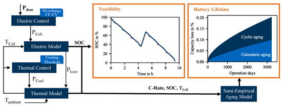 The shown power profile serves as the input variable for the electro-thermal aging model, illustrated in Figure 4. It consists of an electrical and a thermal submodel, each with a control algorithm, and an aging model. Based on the power profile to be simulated, the SOC curve can be calculated by the electrical submodel, which is required to assess the feasibility of the individual use cases. In addition, the SOC and C-rate curves, based on the electrical model and the cell temperature curve, are included in the semi-empirical aging model to calculate the battery life for the cost model. The details of the individual sub-models are presented below. We assume that all cells of the battery pack have the same initial conditions and the same temperature, and thus assume that the battery pack behaves like a single cell. Therefore, the demanded power at cell level is calculated according to the installed battery capacity and the used cell data, shown in Equation (1).