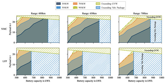 In Figure 5, the results of the feasibility analysis are shown, which investigate if the use case can be carried out at the batteries’ end of life. The two rows indicate the results for both the NMC and LFP cell chemistry, whereas the columns show the influence of increasing daily range. In all cases, the gravimetric and volumetric limits are shown. With the limit in GVW, less payload can be transported with increasing battery capacity and, therefore, battery weight. At 672 the maximal transportable payload for NMC is , compared to when using the LFP chemistry. In terms of the limit caused by the batteries volume, the NMC chemistry shows a maximal installable capacity of 868 compared to 672 achieved by the LFP chemistry. These results are shown in all the following figures.