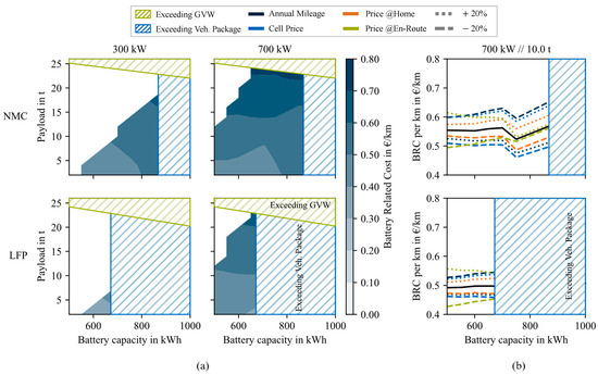 The results, which answer the question of whether oversizing of the battery is cost-effective, are shown in Figure 6. In Figure 6a, the battery-related costs are shown, and in Figure 6b, the used parameters are varied in the context of a sensitivity analysis. In this case, again, the limits in relation to GVW and vehicle package and the non-feasible use cases are shown.