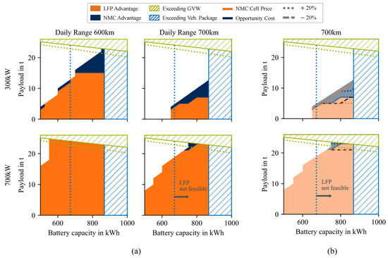 In all figures, the feasibility limits for the LFP as well as those of the NMC are shown. In the range between the LFP and NMC volume limits, the maximum possible design of the LFP chemistry is compared with the correspondingly larger battery capacity of the NMC chemistry. At a specific payload, it is, therefore, possible to install a larger battery using NMC chemistry, thus obtaining the trade-off between the advantages of oversizing and the disadvantage of a higher cell price with the switch to NMC cell chemistry. In cases where higher payloads must be transported, which is possible with a larger NMC battery, but not for the maximum version consisting of LFP, the corresponding NMC version is compared with the maximum possible LFP battery. The difference in the transportable payload is considered as additional costs using opportunity costs.