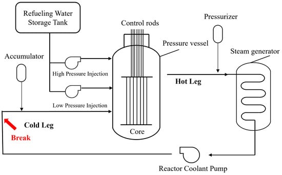 A loss-of-coolant accident (LOCA) is a prevalent type of mishap in nuclear power plants, posing significant potential hazards. As shown in Figure 1, the LOCA originates from a leakage in the reactor system, which causes the coolant to escape and leaves the reactor vulnerable to high temperatures and subsequent damage []. The severity of the LOCA varies depending on the size of the breach, which requires customizing emergency measures accordingly. Consequently, estimating the breach size of the LOCA is a crucial step in accident response planning, as it provides essential information for determining appropriate emergency response actions. Neural network models have emerged as an effective and popular strategy for describing accident behavior []. Therefore, in this study, our aim is to thoroughly investigate the performance metrics of fundamental neural networks within the domain of deep learning. The names and abbreviations of the primary parameters in this article are shown in Table 1.
