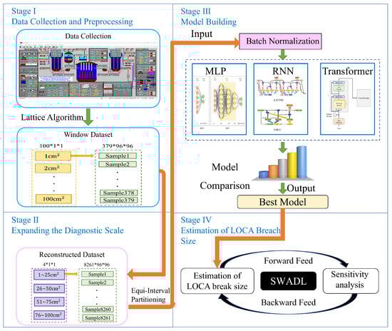 As illustrated in the flow diagram in Figure 2, the proposed DeepLOCA-Lattice framework consists of four main stages: data collection and preprocessing, expanding the diagnostic scale, model building, and estimation of the size of LOCA breaches. In the data preprocessing stage, the lattice algorithm is used to segment the original data into smaller windows, allowing the capture of temporal dependencies between data samples and the extraction of meaningful features for classification. After data preprocessing, four classes are defined based on the size of the LOCA breach using an equal-interval partitioning approach for expanding the diagnostic scale. For stage III, we experimented with five different deep learning models for the estimation of the LOCA breach size and the detection of key factors for the estimation model, namely, the simplified MLP, MLP, LSTM, GRU, CNN, and transformer models. Lastly, in a nuclear power plant during normal operation, if a LOCA incident occurs, the parameters from various sensors are input into our model, enabling the specific LOCA breach sizes to be estimated.