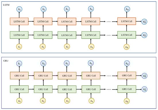 In the processing of temporal data using traditional neural networks, the correlation between temporal data is often ignored. To address this issue, RNNs are proposed and have been widely applied in various fields such as natural language processing (NLP), machine translation, speech recognition, and fault diagnosis []. However, because of the problems of gradient explosion and vanishing gradients, RNNs are unable to handle long-term sequences effectively. As a result, researchers introduced improved RNN algorithms, namely, long short-term memory networks (LSTMs) and gated recurrent units (GRUs), which have successfully overcome these issues.