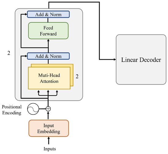 The transformer model [], consisting of an encoder and decoder, offers the key advantage of parallel computation. Our DeepLOCA-Lattice-based implementation incorporates a positional encoding layer, two transformer encoder layers, and a linear decoder, as shown in Figure 7. The positional encoding function generates position embedding vectors using the sin–cos formula, and the network weights are initialized before applying transformations to the input data. This process converts the input tensor size from 32 × 96 × 96 to 96 × 32 × 96 while normalizing it. The positional encoding vector is then added to the input data, resulting in a new input vector. The input is then encoded using the transformer encoder based on the set-masked input tensor mask that conceals information from certain positions in the input tensor. Finally, the output of the encoder is decoded linearly to obtain the prediction results.