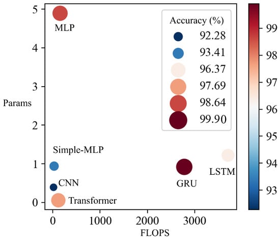 Models positioned towards the bottom left corner, such as the transformer, indicate lower computational complexity and a smaller number of parameters, while those towards the top right indicate higher computational complexity and a higher number of parameters. The color gradient from blue to red illustrates a scale from lower to higher accuracy, suggesting that models with more FLOPs and params tend to achieve higher accuracy, with the GRU model marked by the largest and darkest dot reflecting the highest accuracy among the compared models. Our results show that all models achieved high accuracy rates, exceeding 90%. Among these models, the GRU model achieved the highest accuracy rate of 99.90%, followed by the transformer model with an accuracy of 99.69%. The MLP, LSTM, simplified MLP, and CNN achieved accuracies of 98.64%, 96.87%, 93.41%, and 92.28%, respectively.
