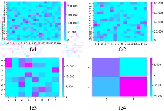 Heat map of LOCA break size (78 cm2) during four-layer MLP processing. In the fc4 results, the coordinate (0,0) represents a LOCA break size area of 1–25 cm2, (1,0) indicates 26–50 cm2, (0,1) signifies 51–75 cm2, and (1,1) denotes 76–100 cm2.