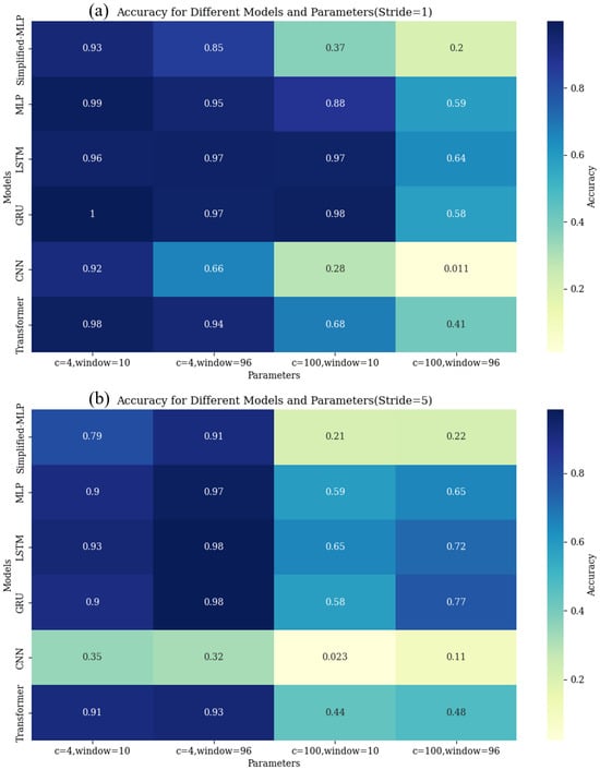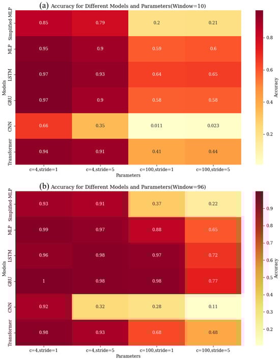 The accuracy of different models for data of various categories and sliding strides: (a) The distribution of model accuracy for different categories and different window strides when the window size is fixed at 10. (b) The distribution of model accuracy for different categories and different sliding strides when the window size is fixed at 96.