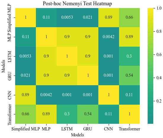 In conclusion, the results of the Friedman test are indicative of statistically significant differences in the performance of the evaluated models. Furthermore, we use the post hoc Nemenyi test to assess the differences between groups. As shown in Figure 12, there is a matrix of p-values indicating the statistical significance of differences between pairs of models. The colors range from dark to light, with darker shades representing lower p-values, and thus, more significant differences between model performances. The color bar on the right-hand side indicates the scale of significance levels. It can be interpreted from the heatmap that the comparison between the GRU and CNN models results in a very low p-value (0.001), shown by the dark color, suggesting a statistically significant difference in their performance rankings. Conversely, the comparison between the LSTM and GRU models, with a p-value of 0.9, is represented by a much lighter color, indicating no significant difference between these two models’ rankings.