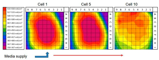 Figure 1 shows that this is of great importance for reliable operation by visualizing the current density distribution of three different cells within a 10-cell stack of a water-cooled PEM fuel cell. The entire media supply of the stack is located on one side of the stack, close to the first cell.