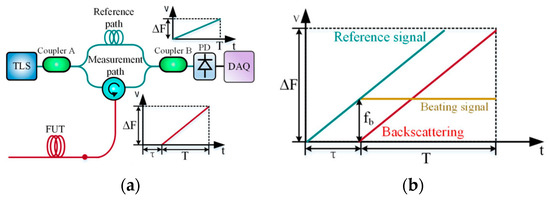 OFDR system. (a) Configuration according to the Mach–Zehnder Interferometer principle. (b) Beating signal between reference and backscattering signals under linearly optical frequency tuning condition [10].