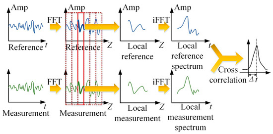 A change in temperature or strain causes a shift in frequency. The magnitude of this shift is calculated for each segment by transforming the signal from the frequency domain back to the time domain using inverse FFT, enabling the application of a cross-correlation algorithm. The signal processing steps are illustrated in Figure 3.