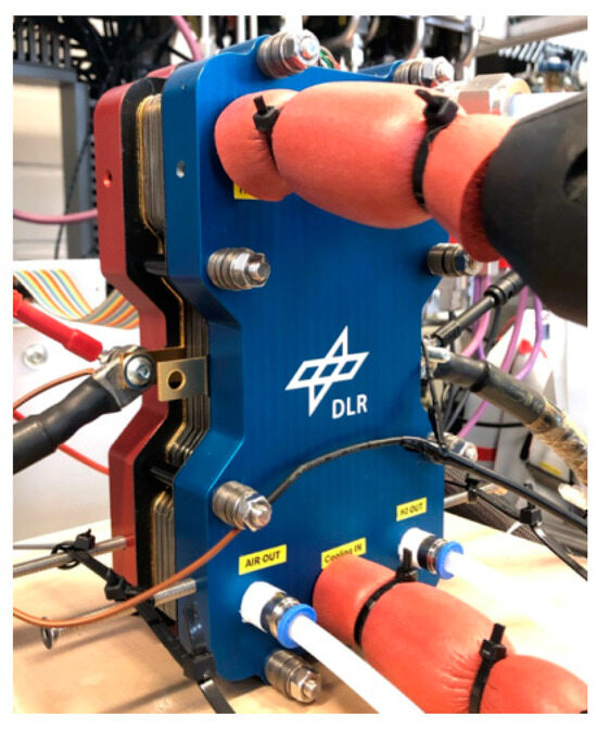 This section provides a description of the specific fuel cell stack utilized at DLR, focusing on its components, parameters, and design. The fuel cell used for sensor integration is developed in the DLR internal TM Project FC-REX for hydrogen-powered cargo pedelecs within the EU Interreg Project FCCP (Fuel Cell Cargo Pedelec, GA: Interreg NEW596). This compact water-cooled fuel cell stack is specifically designed for light electromobility, is capable of achieving long durability even under harsh operating conditions and providing significantly more power than modern batteries, and allowing for a cold start even at temperatures as low as −20 °C in freezing conditions [18]. Figure 4 shows the integrated fuel cell stack on the test bench.