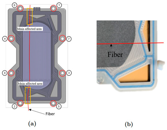 Fiber positioning on the BPP. (a) Tightening torque set up for analyzing the main affected area. (b) Detail of the positioned fiber.