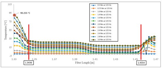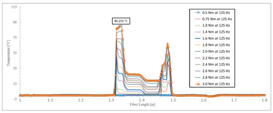 This experiment confirms that mechanical strains in the form of compressive forces applied to the fiber result in erroneous temperature-offset readings. Multiple tests revealed that when the tightening torque exceeded 1.4 Nm, data loss occurred at measuring points located in the main affected zone near the tightening area. To address this issue, spatial average windows were utilized to complete the curve steepness on both peaks shown in Figure 8.