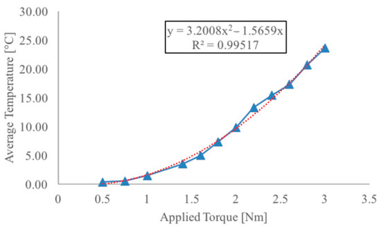 The experimental data demonstrate a strong correlation between the applied torque and the average temperature measured across the active area, accurately represented by a second-order polynomial function (Figure 10).