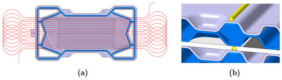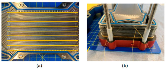 In the final prototype concept, a complete stack was instrumented with a fiber sensor that was adhered to the BPP using epoxy, which was identified and evaluated before. For ease of installation and handling, the fiber was positioned every four channels within the BPP, as shown in Figure 12a. After positioning on the cathode side, the end plate was included to complete the assembly, as depicted in Figure 12b.