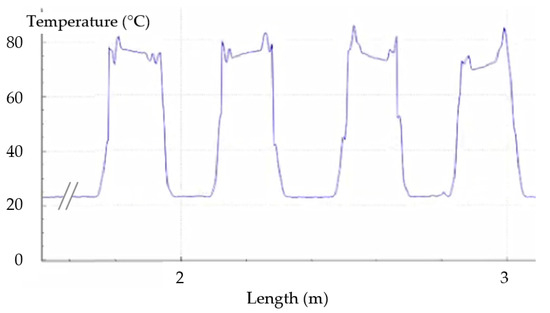 Firstly, it was observed that during the warm-up phase, the temperature lines of the fiber exhibited more instability, likely due to a lack of spatial average windows. In contrast, a more stable temperature wave was observed at 70 °C, attributed to the use of 3 gauge spatial average windows to mitigate unstable behavior in areas with missing data. The variations in measurement patterns can be attributed to both possible misalignment of the fiber during assembly and its location within the stack.