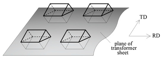Arrangement of grains in a transformer sheet with Goss texture; RD and TD—the rolling and transverse directions, respectively.