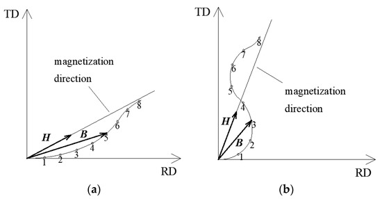 In these materials, magnetization depends significantly on the field strength. If the magnetization direction is the same as or perpendicular to the RD, then the flux density vector is in the same direction as the magnetic field strength. Otherwise, the field strength and flux density vectors are not collinear. Figure 2 shows examples of changes in the resultant flux density vector for two directions where changes occur in the magnetic field strength. If the field strength direction is close to the RD, then the direction of the resultant flux density vector is close to the RD (Figure 2a). Notably, the flux density measured along the field strength direction is the projection of the resultant flux density vector in this direction, which is crucial because in calculations of the magnetic field distribution, the resultant flux density at a specified point on the transformer sheet should be considered instead of its projection in the magnetization direction. The magnetization process is more complex when the field strength direction is close to the transverse direction (TD). In the initial phase where the field strength increases, the flux density component increases along the RD, whereas the flux density component increases slightly along the TD. When the field strength is further increased, the flux density component along the RD reaches a certain maximum value and then begins to decrease. Simultaneously, the flux density component increases along the TD (Figure 2b). In fact, such tendencies of the flux density have been described by H. Pfützner [7], who reported that such a magnetization process was due to the “disintegration” of domains whose flux density vectors were close to the RD and the growth of domains whose flux density vectors were parallel to the TD. In iron crystals, the most difficult magnetization occurs when the magnetization direction creates an angle of 54.7° with respect to the RD. If magnetization occurs at an angle smaller than 54.7°, then 180° domain walls are reconstructed. Otherwise, the 180° walls are rebuilt as 90° walls. Similar conclusions were presented by Mao and Atherton [8]. In this magnetization process, the flux density vector can be located on one side or on the other in the field strength direction.