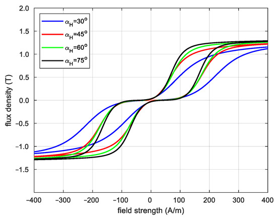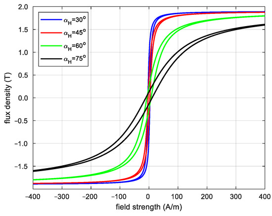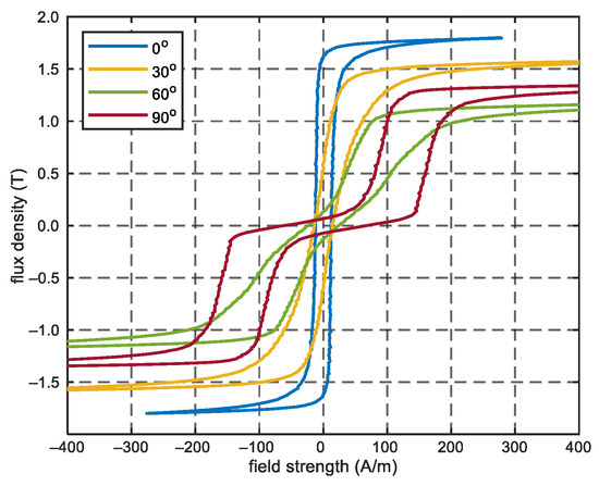 In the magnetization processes of transformer steel sheets, two phenomena occur: the domain wall displacements and the rotation of the flux density vectors toward the direction of the magnetic field strength vector [1,2,3,4]. Both phenomena occur simultaneously; however, in the range of low to medium field strength values, irreversible displacements of the domain walls are dominant; for high field strength values, this process ends, and rotations of the flux density vectors toward the direction of the field strength vector dominate the magnetization process. If the field strength increases, then domains whose flux density vectors are closest to the direction of the field strength increase in volume at the expense of the other domains. At high field strengths, the domain walls disappear and individual crystals become single domains, and then changes in the resultant flux density in the transformer sheets are mainly caused by the rotations of the flux density vectors of individual crystals toward the direction of the field strength. The characteristics of the magnetization process depend not only on the nature of the changes in the magnetic field strength, but also on the parameters of the ferromagnetic material. This process in isotropic materials (non-oriented sheets) does not depend on the field strength direction. In practice, ideal isotropic materials do not exist. Generator sheets, which are referred to as sheets with non-oriented grains, typically exhibit significantly different magnetic properties for field strength changes in different directions [5].