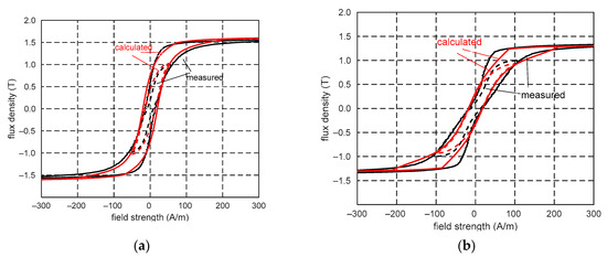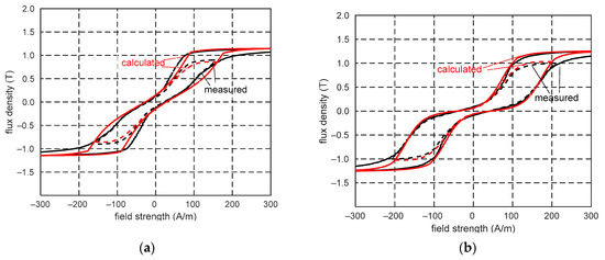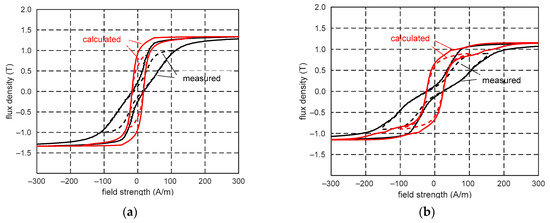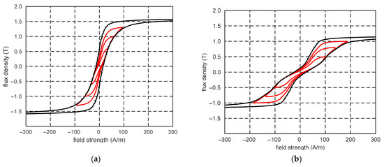 The coefficients defining the limiting hysteresis loops for the individual magnetization directions were selected using the least-squares method such that the differences between the limiting hysteresis loops determined using the proposed approximation method and the measured hysteresis loops were minimal. The partial hysteresis loops, which were within the limiting hysteresis loop for a specified magnetization direction, were determined as described in [28]; this was performed separately for the loops assigned to the RD and TD, where the resultant flux density value is the geometric sum of the flux densities in both directions. In each calculation step, the saturation condition should be verified because the algebraic sum of the flux densities in both directions cannot be greater than the saturated flux density.