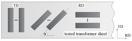 The hysteresis loops were determined using the Epstein frame, which is described in detail in [9]. Despite some shortcomings, the Epstein frame is widely used for commercial magnetic measurements. The measurements of the hysteresis loops were performed at a frequency of 3 Hz (the influence of eddy currents on the measurement results can be omitted). Strips 330 mm long and 30 mm wide were cut at an assumed angle α relative to the rolling direction (RD) from a given transformer sheet (Figure 5). Then, 16 such strips were placed in the Epstein frame and appropriate measurements were made for various currents in the winding forcing the magnetic field. As a result, a family of the minor hysteresis loops was obtained for the assumed magnetization direction.