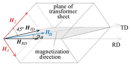 Each cubic iron crystal comprises three easy magnetization axes (Figure 7) [1,4,27]. The sheets investigated in this study were most easily magnetized along the RD. When the field strength direction was not parallel to the RD, magnetization processes occurred to varying degrees along each easy magnetization axis. Notably, magnetization first occurred along the easy magnetization axes; subsequently, the domain structure was rebuilt. Figure 7 shows a certain magnetization direction with the vector Hα of the magnetic field strength and the components HRD and HTD along the RD and TD, respectively, whereas the components H2 and H3 indicate the field strength values along two directions of easy magnetization, which formed a 45° angle with the sheet plane; the magnetization processes along these two axes are the same. Consequently, the changes in the flux density along these two axes are the same, and the projection of the sum of these flux densities onto the sheet plane can be regarded as the flux density in the TD.