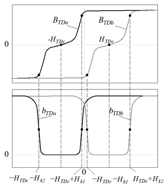 where Hk = Hk1 for HTD > −HTDc or Hk = Hk2 for HTD < −HTDc. Here, Hk denotes the field strength when the irreversible displacements of domain walls end. Figure 10 shows an example of a certain “atypical” hysteresis loop with parameters HTDc, Hk1, and Hk2.