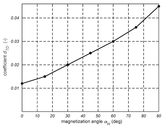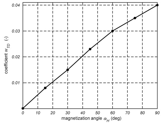 The coefficients wTD and dTD in Equation (4a,b) significantly affect the changes in the values of bTDb and bTdu. The parameter Hk1 is the distance between the HTDc and the inflection point on the curve BTDb. Meanwhile, Hk2 is a distance between HTDc and the inflection point on the curve BTDb. The coefficients bRD, wTD, dTD, and Hk were determined using the least-squares method to minimize differences between the measured and calculated hysteresis loop. Their dependence on the magnetization angle is shown in Figure 11, Figure 12, Figure 13 and Figure 14.